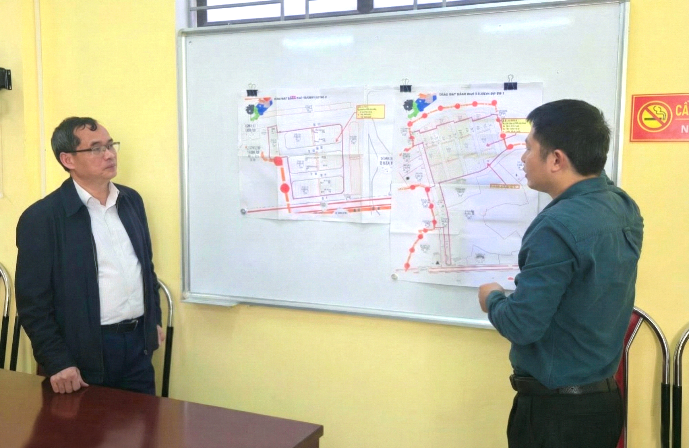 Đồng chí Bí thư Đảng ủy và các đ/c Ủy viên BTV Đảng ủy nghe đại diện chủ đầu tư Vingroup thuyết minh về tiến độ xây dựng các khu tái định cư trên địa bàn